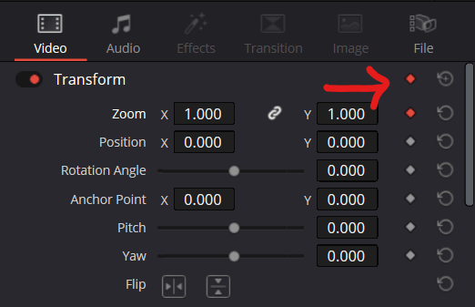 Keyframing is when you go to a specific point in a video and define the properties of an object or graphic, such as its position, scale, rotation, opacity, and more. These keyframes act as anchor points that dictate how the graphic should change over time. In Davinci Resolve, you can tell a keyframe has been set by the red dots in the Inspector: