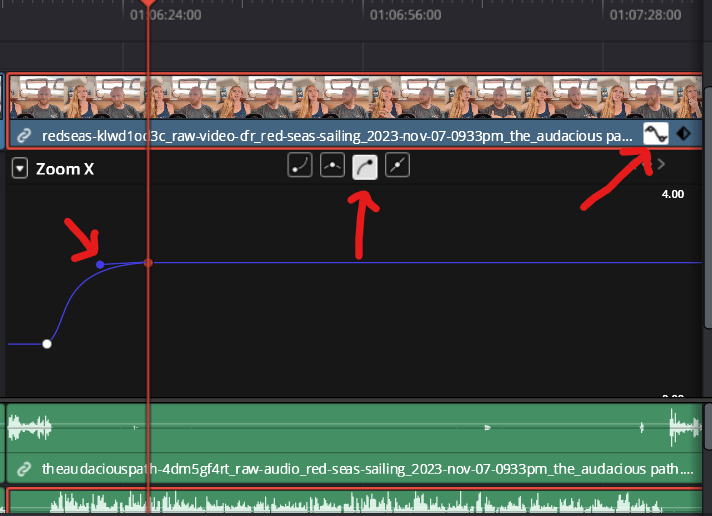 - Smooth it out: Smooth out the keyframe for a more natural look. Below is an example of how to access this function in Davinci Resolve. The first arrow enters the area of the clip where you can do this. The second arrow chooses which smoothing out option you’d like to use. And the third arrow allows you to move around the little handle to adjust the smoothing feature. (third arrow). You can see the middle arrow is creating a curve (look at first arrow) that makes the changes in the second keyframe happen in a more smooth curve rather than an abrupt change.